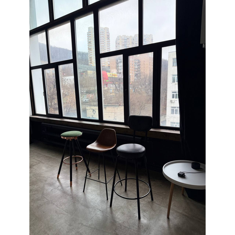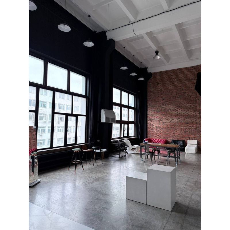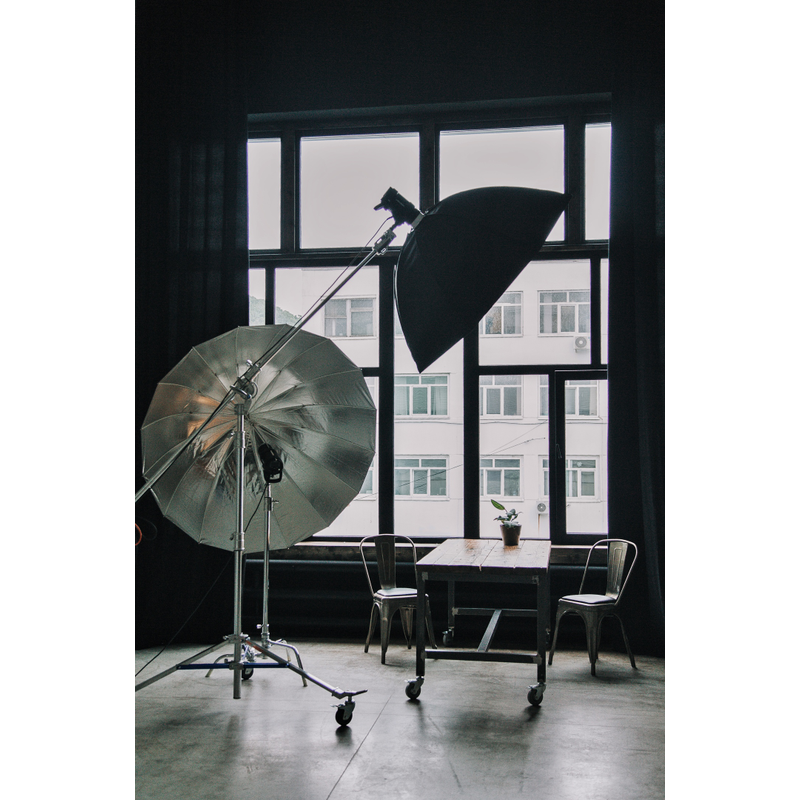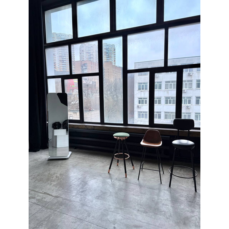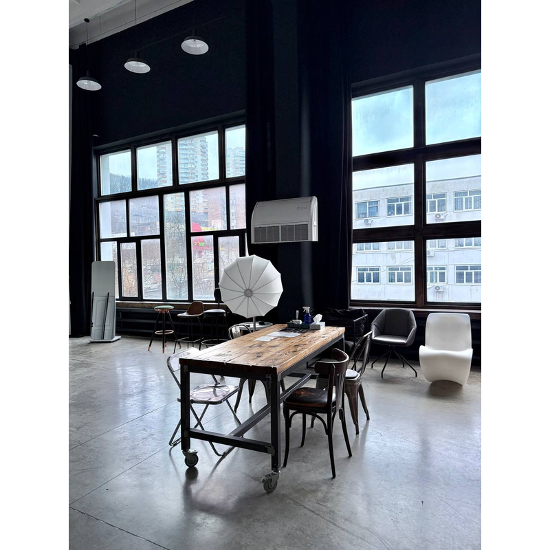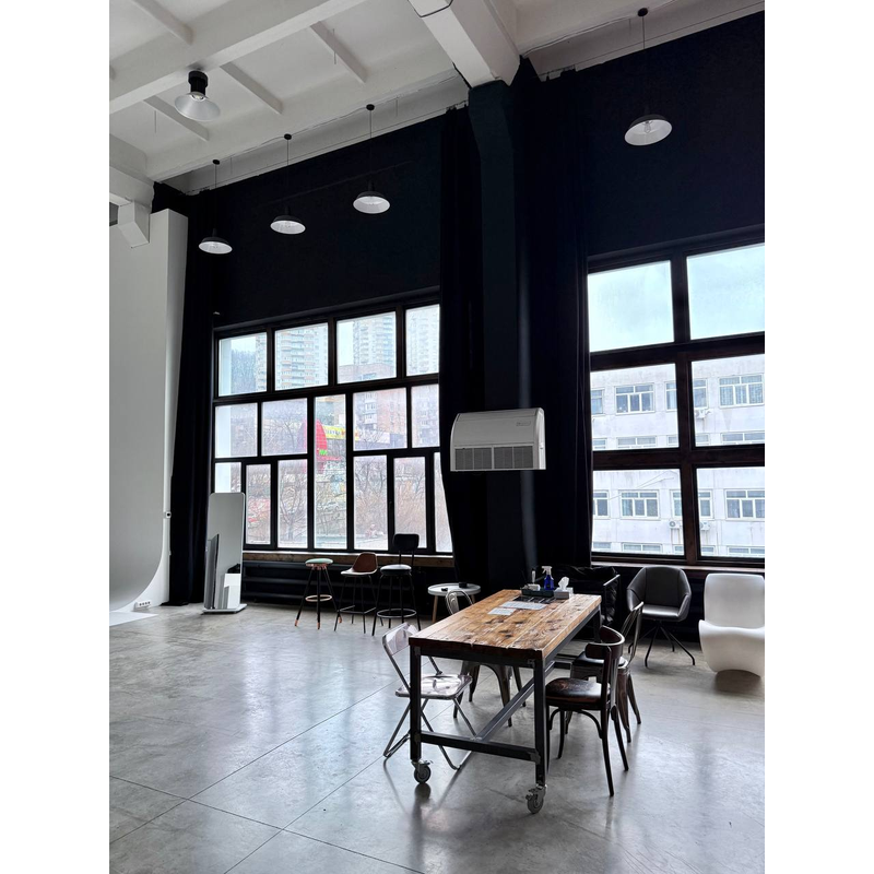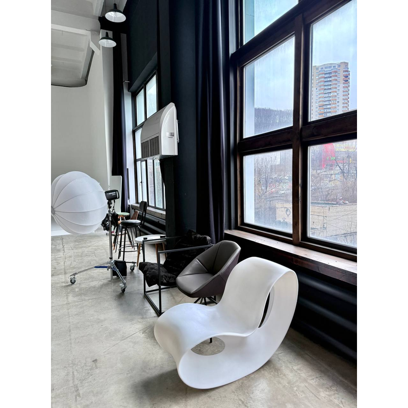 Северо - Восточная сторона, позволяет снимать с мягким рассеянным светом от окон. Жесткий свет с 7:00 утра до 10:00 утра, после 10:00 рассеянный дневной свет. Так же студия оснащена большим количеством различного оборудования и мебелью.