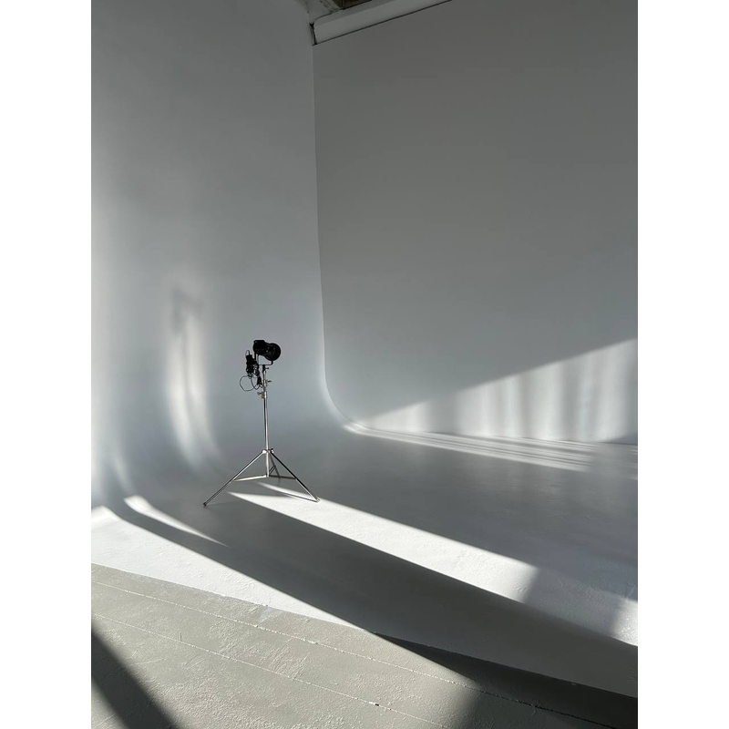 Площадь первого этажа представляет собой квадрат зонированный на 4 части: черную циклораму, белую циклораму, зону с лестницей и зону бетонной стены и пола, идеально подходящую под сьемки контента и LooK BooK